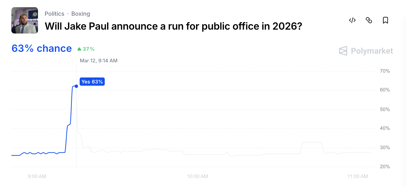 트럼프의 이 발언 직후, '제이크 폴이 2026년에 공직에 출마할까?' 마켓은 Yes 63%까지 급등했습니다. 하지만 이후 Yes는 현재 28%까지 급락한 상황인데요.